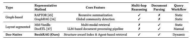 所以多数现有的文档级RAG系统要么忽略文档的层级结构,要么缺乏查询感知的检索流程。结果是经常遗漏关键证据或检索效率偏低;在DocETL这类版面感知管道中Token开销和响应延迟也比BookRAG更高。