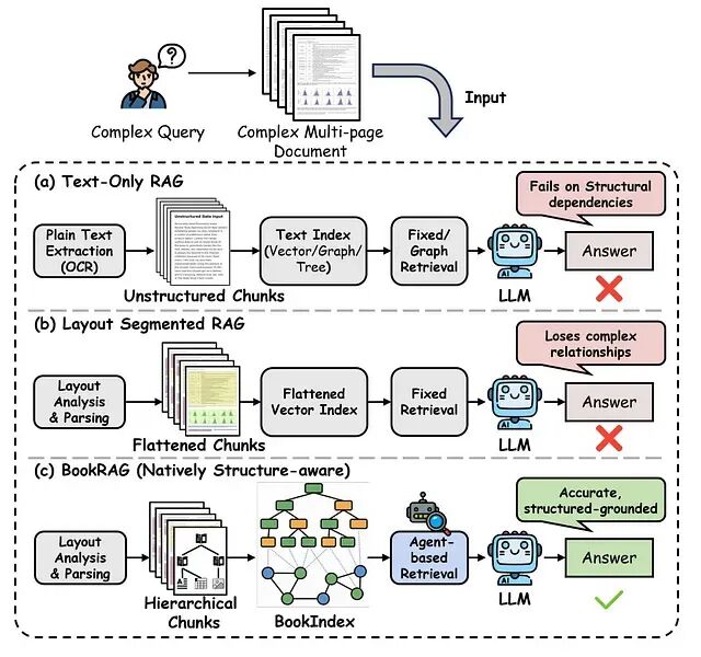 面对长文档的复杂问答场景包括:结构化手册、技术报告、研究论文,BookRAG给出了一个经过基准验证的设计方向。它构建文档原生索引BookIndex,将层级树、知识图谱和图-树链接整合在一起,再配合一个能沿信息"线索"导航的Agent。