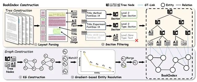 Figure 3: The BookIndex Construction process. This phase includes Tree Construction, derived from Layout Parsing and Section Filtering, and Graph Construction, which involves KG Construction and Gradient-based Entity Resolution.