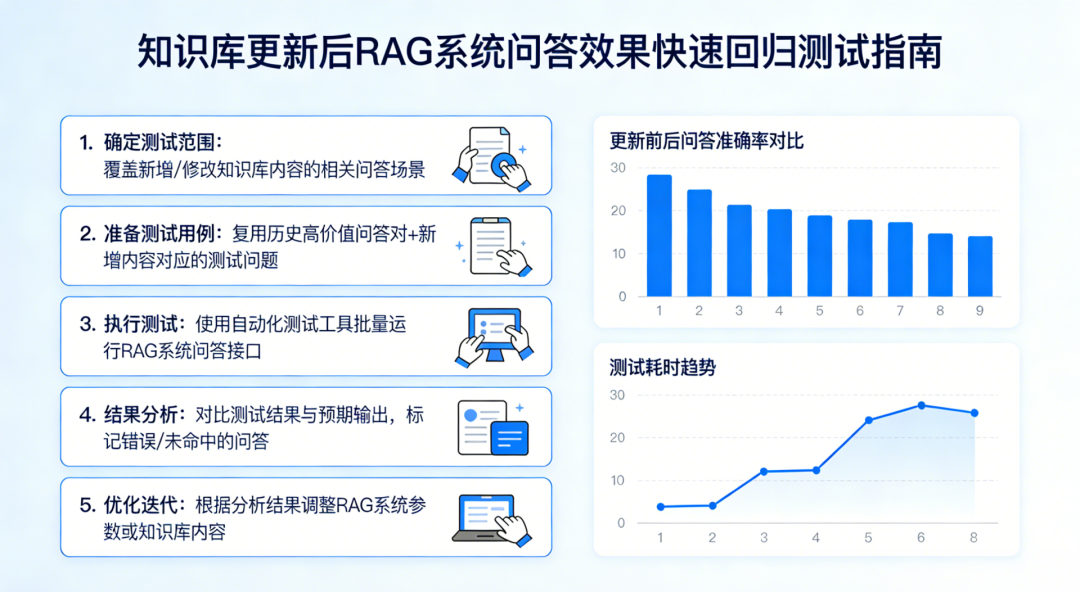 高价值问题集的优先保护:在完整的测试问题集中,识别并维护一个“高价值核心问题集”——这些问题代表了产品最核心的使用场景,是用户最频繁提问的问题,或者是一旦回答错误后果最严重的问题。无论本次知识库更新是否直接涉及这些问题的相关知识域,核心问题集在每次更新后都必须被完整回归测试。