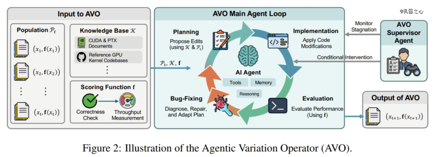 AVO打破了这一局限,将“变异算子”实例化为一个自我驱动的智能体循环。这个AI智能体可以自由查阅之前的代码版本记录、调用领域专属的知识库(如CUDA编程指南和PTX架构文档),并根据执行反馈来主动提出、修复、批判和验证代码修改。