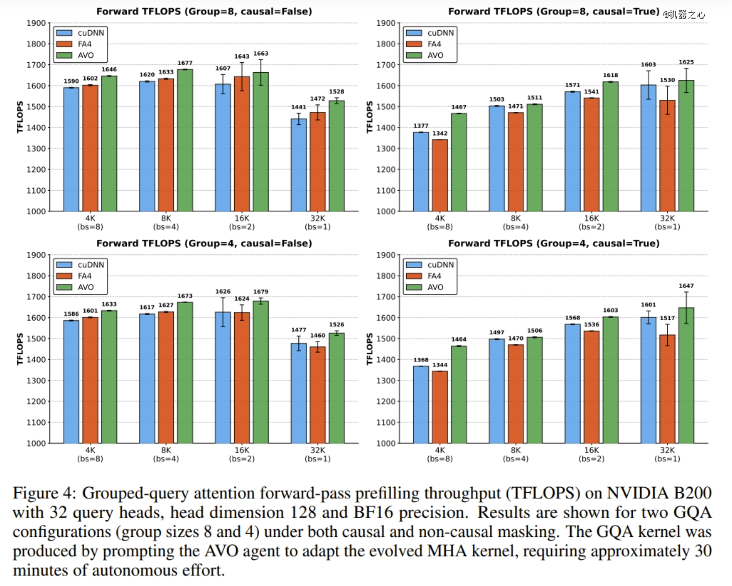 研究团队将AVO部署在一项极具挑战性的任务上:在NVIDIA Blackwell B200 GPU上优化多头注意力(Multi-head Attention,MHA)核心代码。注意力机制是Transformer架构的核心,也是AI芯片上被优化得最密集的计算目标之一。