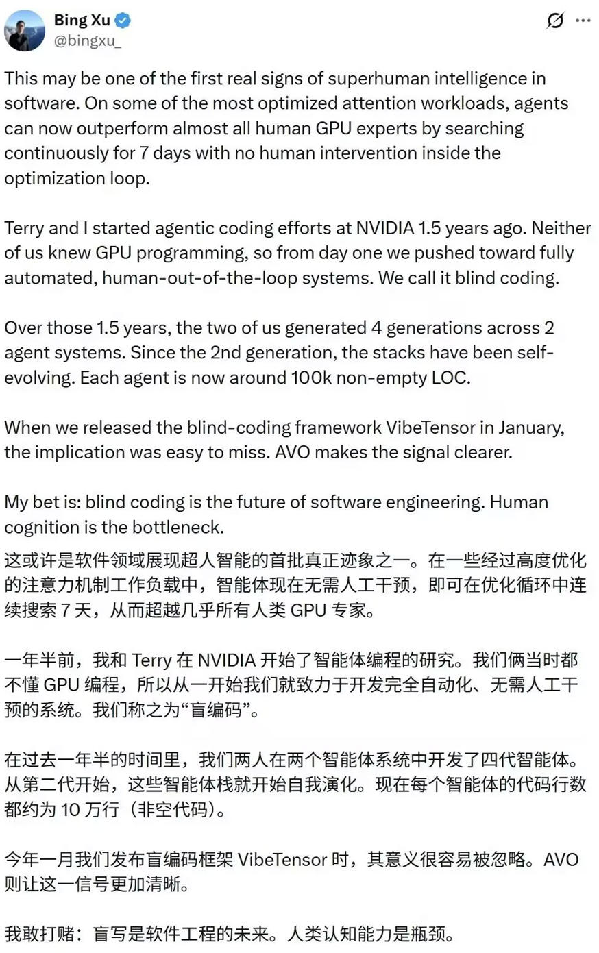 有意思的是,许冰在X推文中分享说,一年半之前他与Terry Chen刚开始在英伟达研究智能体编程时,他们还不懂GPU编程。“所以从一开始我们就致力于开发完全自动化、无需人工干预的系统。”他们称之为“盲编程”(blind coding)。