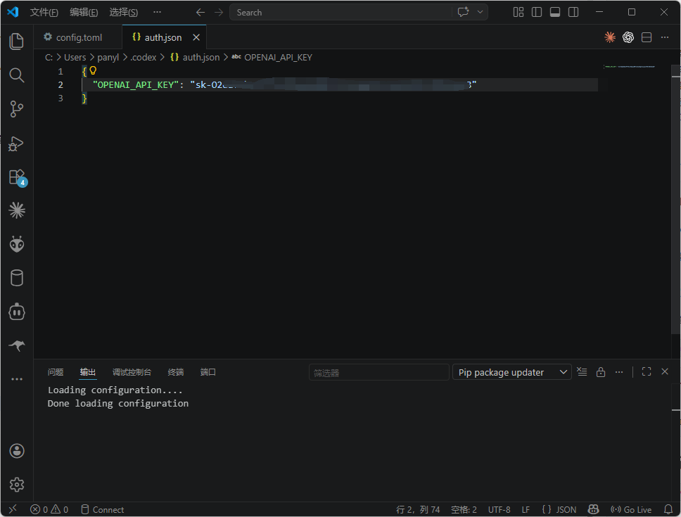 openai_base_url = "https://sg.uiuiapi.com/v1"1.文件配置~/.codex/auth.json 配置示例: