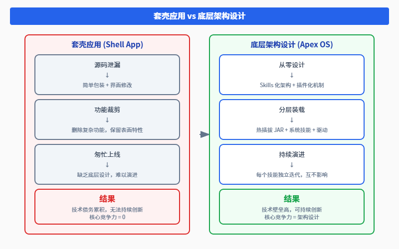 近期,随着某知名 AI 应用源码的意外泄漏,国内市场上关于"套壳应用"又被推崇——这些套壳产品往往仅在原有基础上做了简单的界面包装和功能裁剪,便匆忙推向市场。这种现象再次引发了业界对真正技术壁垒的思考:当源码可以被轻易复制,什么才是一个系统的核心竞争力?