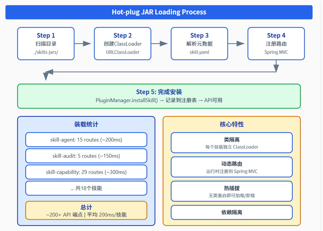 每个 JAR 技能都有独立的 ClassLoader,避免依赖冲突: