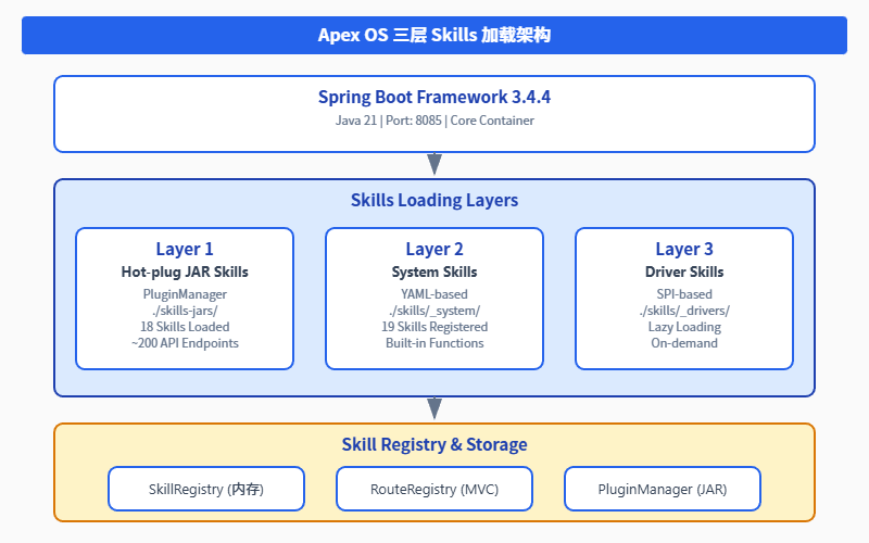Apex OS 采用了三层 Skills 加载架构,这种设计使得系统能够在启动时按需装载功能模块,实现真正的热插拔能力。
