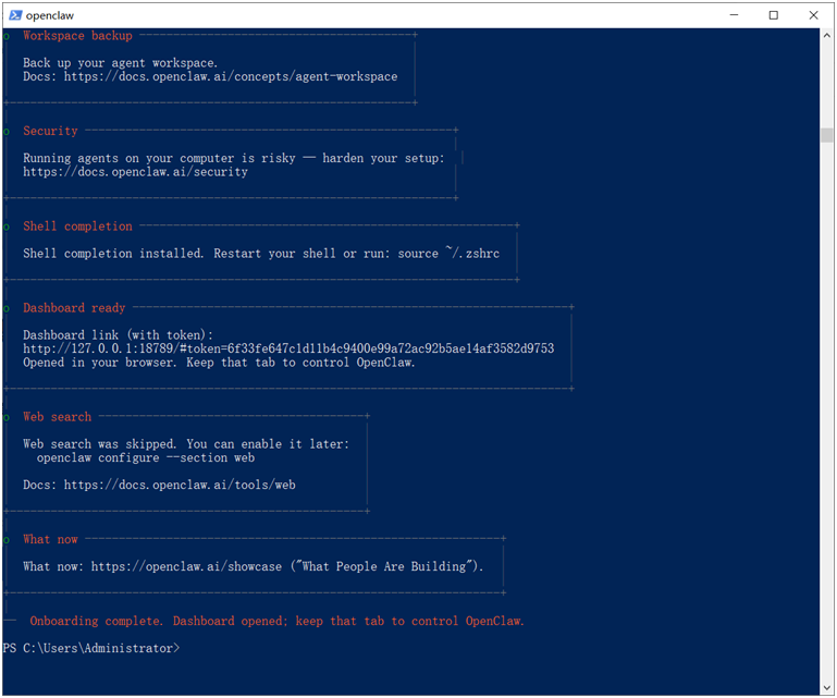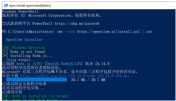 iwr -useb https://openclaw.ai/install.ps1 | iex回车执行,显示界面如下,表示正在安装,一切OK,请耐心等待!