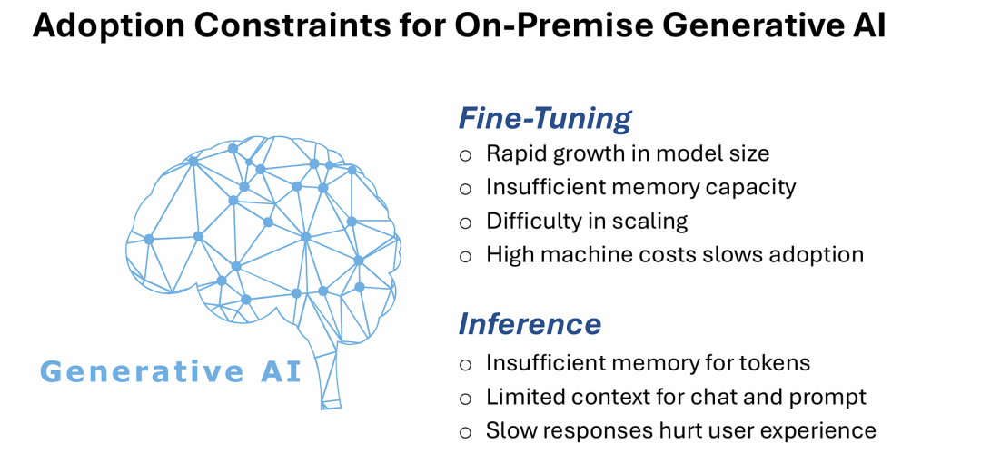 图片的核心观点是:企业在本地环境(On-Premise)部署生成式AI时,主要面临着由底层计算与存储基础设施(尤其是内存/显存资源)引发的严重瓶颈。