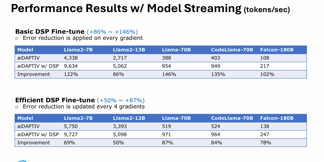 数据表明,无论是高频更新(Basic)还是低频更新(Efficient)策略,DSP 都能有效打破系统瓶颈。特别值得注意的是,在基础微调模式下,对于像 Llama-70B 这样参数量巨大的模型,性能提升甚至可以达到近乎 1.5 倍(146%)。这从定量角度印证了前一张 PPT(异步并行流水线) 中提到的理论架构优势:即把低复杂度的“脏活累活”交给存储端的 DSP,让 GPU 专注算力输出,确实能实现“1+1>2”的系统级加速效果。