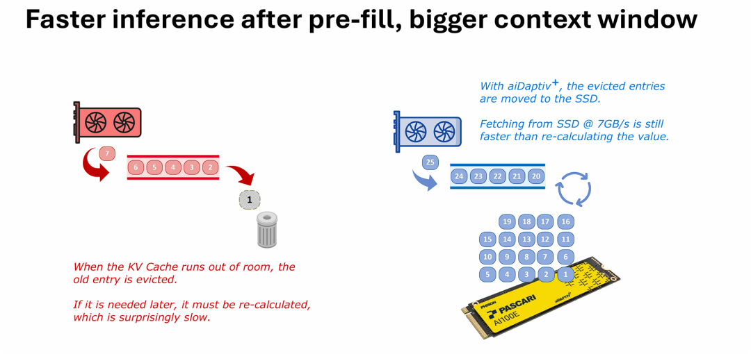 群联的方案巧妙利用了高性能 NVMe SSD(如图中提供 7GB/s 读写带宽的盘)作为显存的溢出层。当 GPU 显存放不下时,历史 KV 状态会被“转移”而非“丢弃”到 SSD 中。