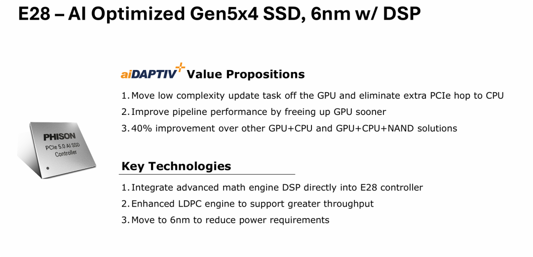 方案采用标准 M.2 SSD(如 aiDAPTIV+ 的 PASCARI AI100E)。在 M.2 狭小空间与个位数瓦特功耗限制下,塞入发热大、成本高的独立 FPGA 不现实。群联 E28 主控采用 6nm 工艺,将 “Advanced math engine DSP” 作为 IP 模块内置集成到 SoC 内部,实现特定领域 ASIC 化。这未破坏标准 SSD 形态,并极佳地控制了成本与功耗,支持大规模量产。