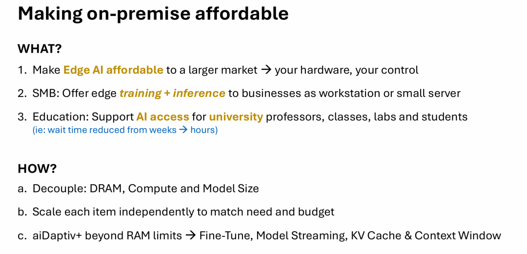 PPT中提出的解决方案是通过“解耦”思想和名为“aiDaptiv+”的存储管理技术,突破物理内存容量的瓶颈。这使得中小企业(SMB)和教育机构只需使用成本较低的工作站或小型服务器,就能独立且灵活地扩展资源,完成大模型的训练(微调)、推理以及长文本(Context Window / KV Cache)处理。最终实现“硬件自主可控、成本丰俭由人”,极大地提高了AI算力的普惠性和系统效率。