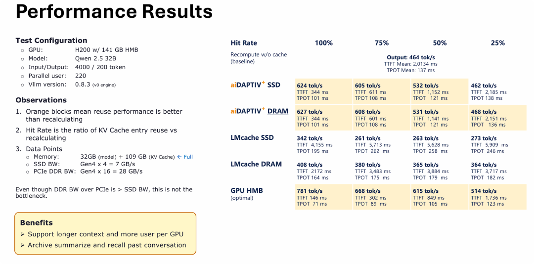 相比之下,aiDAPTIV+ 技术展现出了惊人的调度效率。只要缓存命中率达到 50% 以上,使用普通 PCIe Gen4 SSD 进行卸载的性能就能显著超越 GPU 重算(Gen4 已经在PC端广泛部署)。更令人震撼的是,“aiDAPTIV+ SSD”的性能表现几乎完美咬合了“aiDAPTIV+ DRAM”的表现(624 vs 627 tok/s,100% 命中在现实场景中的可能性不大)。这直接论证了左侧图文的结论:物理带宽(7GB/s vs 28GB/s)在这里已经不是瓶颈,群联的中间件成功掩盖了 SSD 的物理延迟。这项技术切实达成了“用廉价 SSD 容量换取昂贵 GPU 算力”的商业目标。