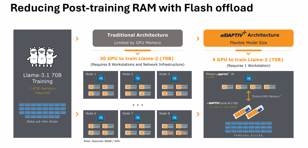 通过引入基于闪存卸载的架构(如群联的aiDAPTIV+),系统可以将无法装入显存的“数据分片”暂时卸载并缓存到高耐久度SSD中。这种创新的存储/内存层级管理技术,使得原本需要8台工作站、30张GPU组成的集群才能完成的训练任务,现在仅靠1台配备4张GPU的单体工作站即可实现,从而以极低的成本和功耗实现了大模型的本地化训练。
