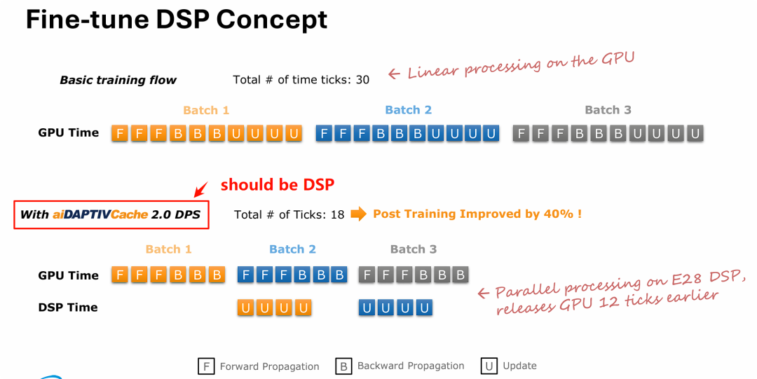 而创新的 DSP 架构(下半图)将“参数更新(U)”这一步骤剥离,交由固态硬盘主控内建的 DSP 异步处理。这使得昂贵的 GPU 资源能够被迅速释放,去执行下一个批次的重度计算任务(F 和 B),最终通过这种近数据并行处理机制,实现了整体耗时缩短和 40% 的性能飞跃。