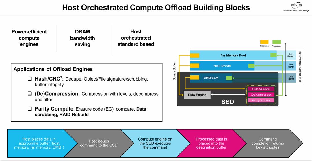其核心观点是:通过在SSD内部集成专用的高能效计算引擎(用于哈希去重、加解压缩、纠删码等计算密集型任务),将原本由主机CPU承担的繁重存储服务下放给底层的SSD硬件来完成。 同时,该架构强调 “主机编排(Host Orchestrated)” ,即控制面和数据面分离——主机端依然保留对整个流程的控制权(决定数据放在哪里、下发什么命令),但数据处理的具体执行面由SSD内的DMA引擎和加速模块来闭环。这种架构显著节省主机DRAM带宽,降低主机CPU负载,基于标准协议(如NVMe的CMB特性)实现,为现代存储系统提供高效、可扩展的数据处理路径。