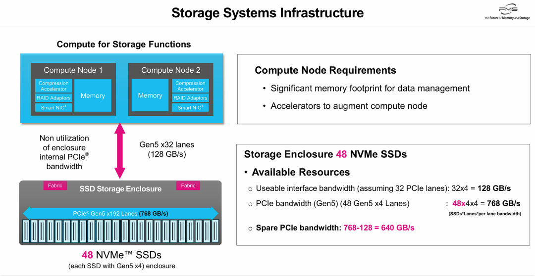 其核心观点在于:现代高密度NVMe盘柜(如48盘位)内部聚合吞吐达768 GB/s。然而,由于连接计算节点与存储盘柜的外部接口带宽受限(仅为128 GB/s),导致 640 GB/s(占比超83%)的盘柜内部PCIe带宽无法被前端业务利用。同时,为了处理这些高速数据,前端计算节点需堆叠大量内存和加速器。这种架构造成性能浪费,显示传统计算节点I/O吞吐落后于闪存介质发展。
