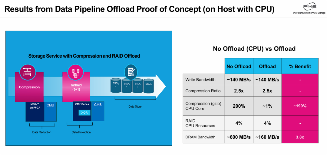 其核心观点通过右侧数据体现:在保持相同存储性能(写入带宽)和数据缩减效果(压缩率)前提下,将计算密集型任务卸载到支持CMB硬件(如FPGA和CM7系列SSD),释放主机资源。