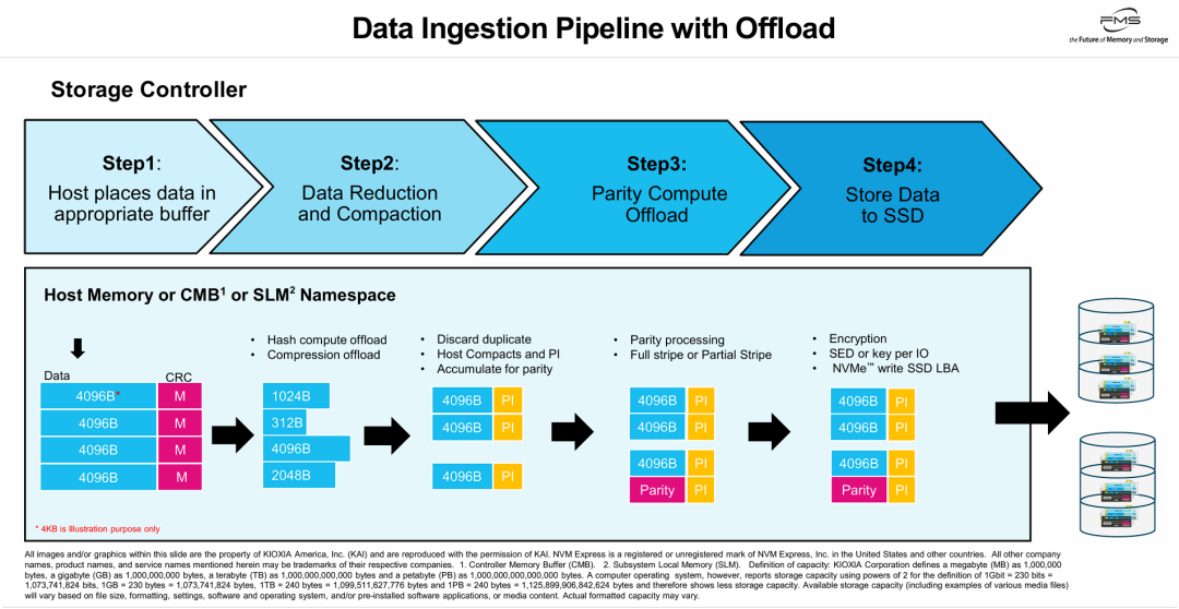 其核心观点在于:通过利用CMB(控制器内存缓冲区)或SLM(子系统本地内存)作为数据流转的“枢纽”,存储系统能够将消耗大量CPU资源的“哈希去重”、“数据压缩”和“奇偶校验(如RAID/纠删码)”等重负载任务卸载给专用硬件。 图表清晰地演示了数据在内存中是如何被压缩成变长数据块、去除重复项、重新紧凑打包(Compaction)成对齐的4KB块并附加端到端保护信息(PI),最终生成条带校验位并安全加密写入NVMe SSD的过程。这种流水线设计优化了I/O路径,减少主机计算和内存带宽压力,同时保证数据安全与写入效率。