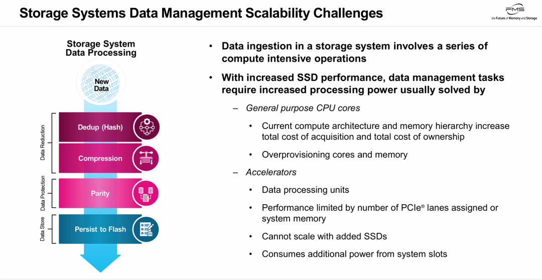 PPT的核心观点是:在全闪存时代,随着SSD性能的快速提升,传统存储系统中负责数据缩减(去重/压缩)和保护(校验计算)的计算密集型流水线面临扩展瓶颈。
