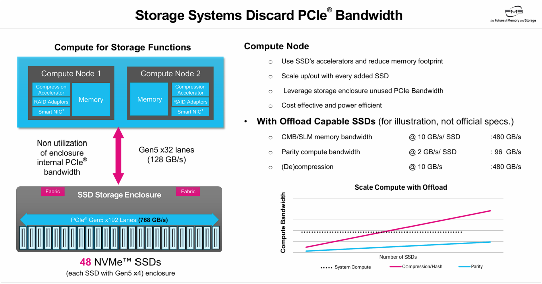 为了匹配高性能SSD的数据摄取速度,现有架构若单纯依靠堆叠通用CPU算力,会导致成本高企且资源浪费(过度配置);而若采用DPU等硬件加速器,虽然卸载了计算,但受限于PCIe通道带宽和供电,当系统中增加更多SSD时,加速器本身会成为瓶颈,无法实现线性扩展。存储行业需要新的架构缓解算力与存储介质性能不匹配。