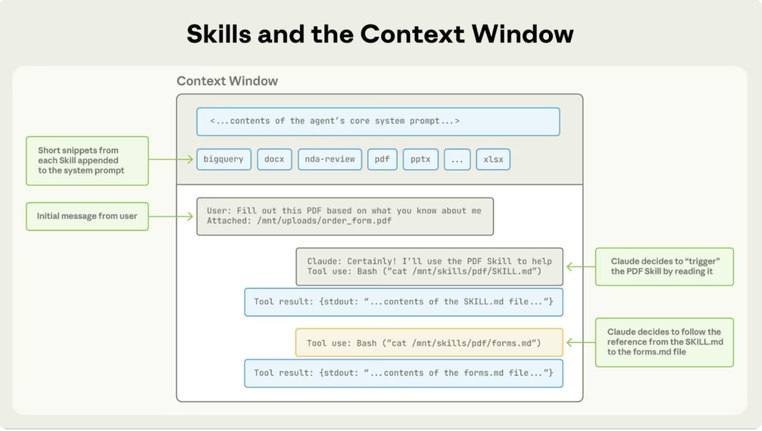 在使用技能执行任务过程中,需要进行多次的模型调用,仅将执行结果放入到共享的上下文窗口中。即保持了多次调用prompt 的连贯性,也防止了执行过程对上下文的干扰。