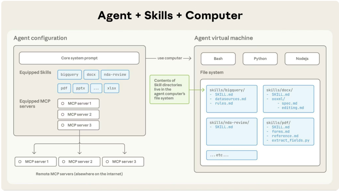 Skill 技能运行在代码执行环境中,模型(Claude)可以访问文件系统、执行 bash 命令并运行脚本。技能视作虚拟机中的一个目录,大模型通过 bash 像在本地电脑上一样浏览文件。