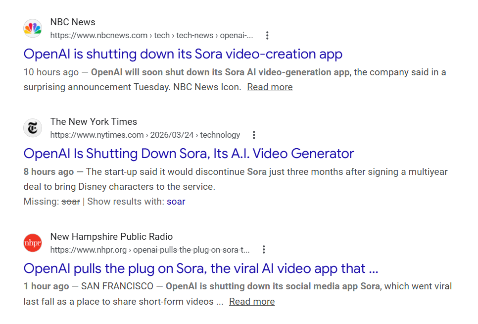 就在昨天2026年3月25日,OpenAI 关闭了10亿美元的合同,对OpenAI 和迪士尼的合同,就在2025年年底签的,10亿美元的AI 视频项目。