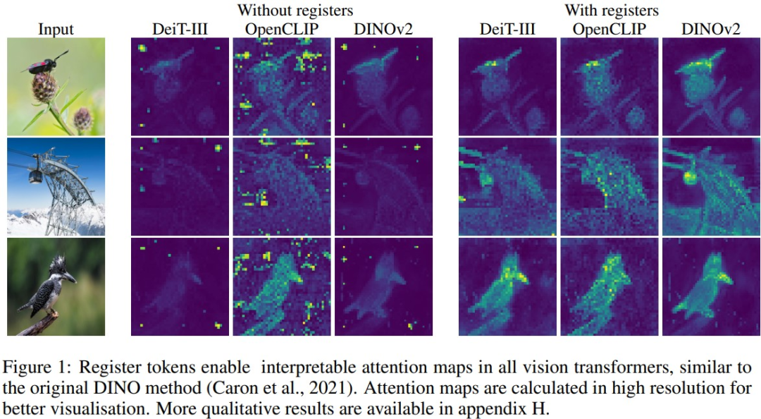 使用一个寄存器就足以消除伪影。在密集任务中,寄存器数量是最佳的,但一个 ImageNet 会随着寄存器的增加而不断增加。他们决定在所有实验中使用 4 个寄存器。