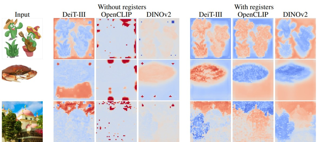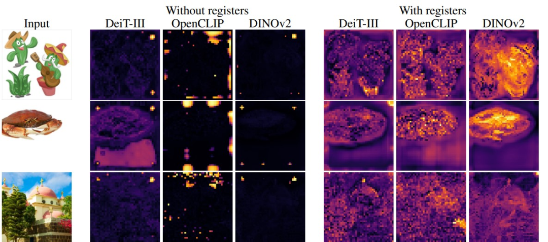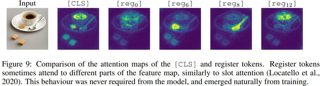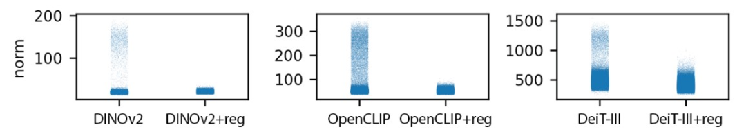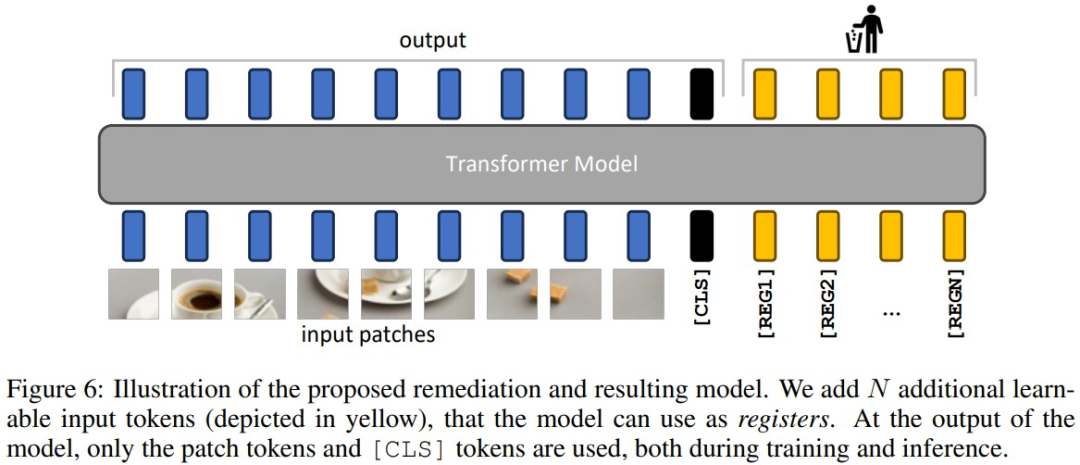 他们提出了一个简单的修复方法:他们明确地将新标记添加到序列中,模型可以学习将其用作寄存器。他们在补丁嵌入层之后添加这些令牌,具有可学习的值,类似于 [CLS] 令牌。