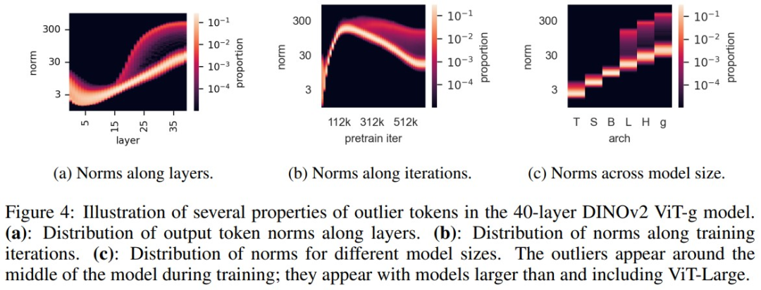 在大模型训练过程中出现异常值,高规范令牌出现在第 15/40 层,训练的三分之一处,并且仅适用于大尺寸 ViT(ViT-H、ViT-L 和 ViT-g)