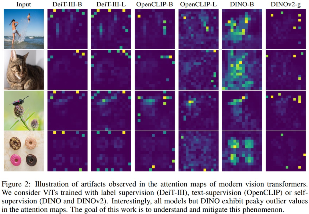 DINO 算法生成具有可解释注意力图的模型:最后一个注意力层自然地关注图像语义一致的部分(图 2)。这允许对象发现算法,例如 LOST。但是,由于特征图中存在伪影,这些方法不再适用于 DINOv2 和其他 ViT(DeiT-III 和 OpenCLIP)。