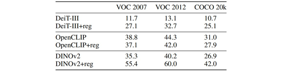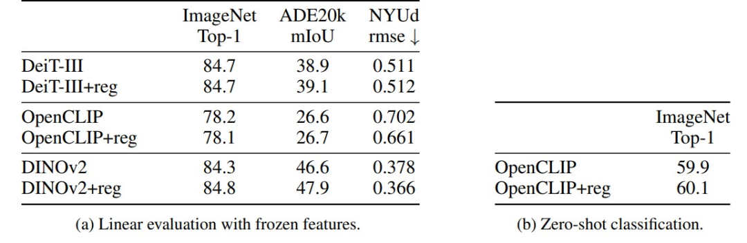 为了检查寄存器的使用是否不会影响表示的质量,他们通过线性探测评估了三个任务的模型:ImageNet 分类、ADE20k 分割、NYUd 单眼深度估计。
