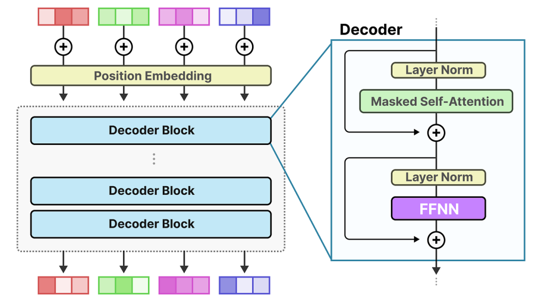 请记住,标准的纯解码器变换器架构在层规范化后应用FFNN: