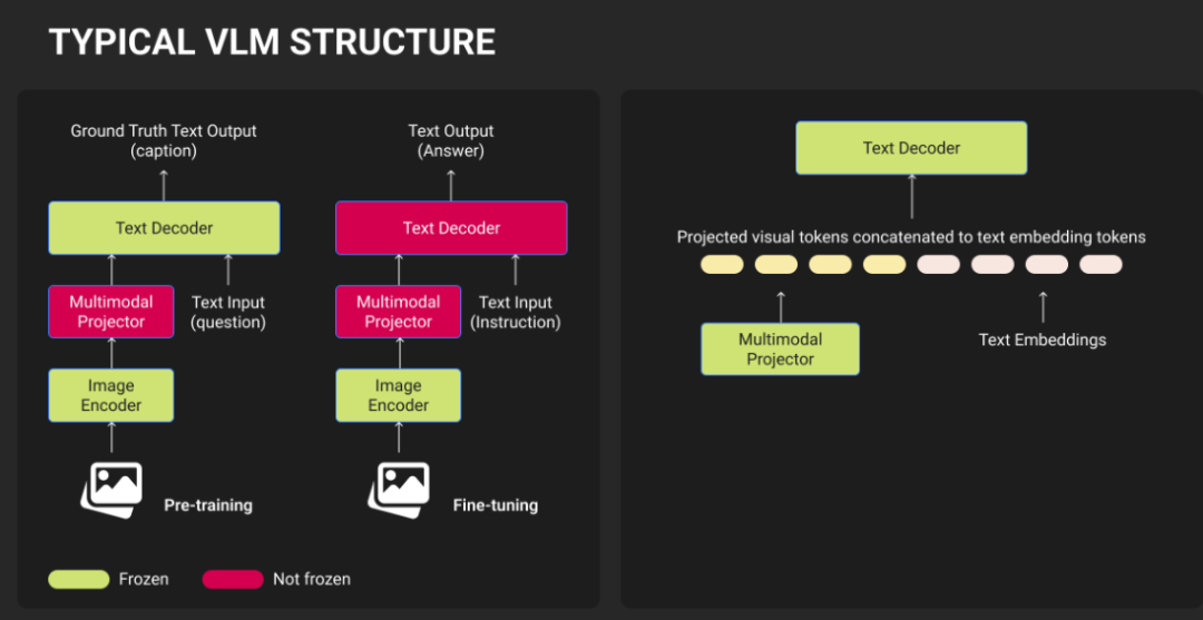 传统的计算机视觉需要为每个任务单独建模。VLM通过自然语言指令处理多项视觉任务,采用单一架构:视觉编码器将图像转换为标记,投影层将其与语言模型嵌入对齐,LLM解码器生成响应。