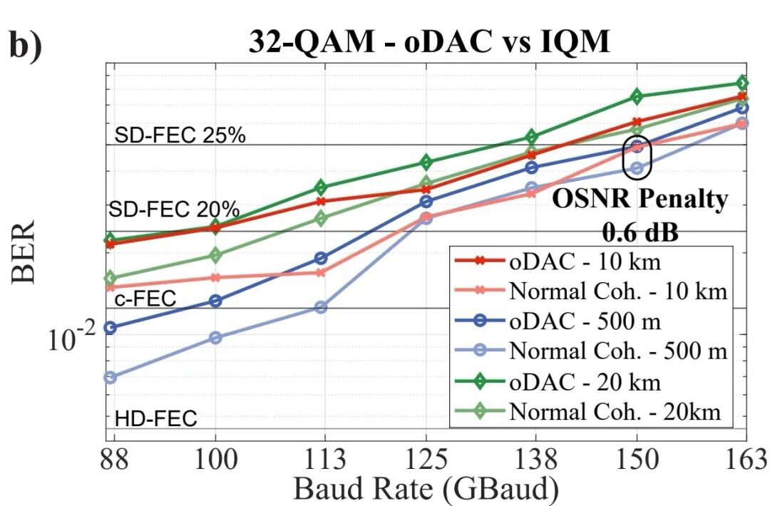 2. 32-QAM调制:在500 m传输距离下,实现了150 Gbaud DP-32-QAM信号的1.2 Tbps净速率传输,BER满足25% SD-FEC阈值,与传统方案相比OSNR代价为0.6 dB。