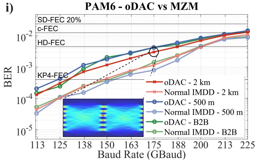 2. PAM6调制:B2B、500 m、2 km距离下性能表现一致,在2 km传输距离下,175 Gbaud PAM6信号实现了410 Gbps净速率传输,BER满足对应FEC阈值要求。