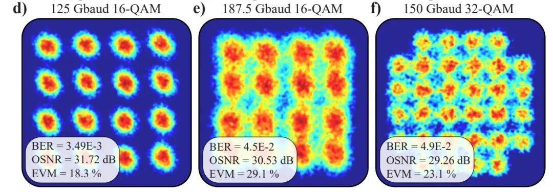 5. 实测星座图显示,DP-16-QAM与DP-32-QAM信号星座对称性优异,验证了该oDAC架构出色的传输线性度。