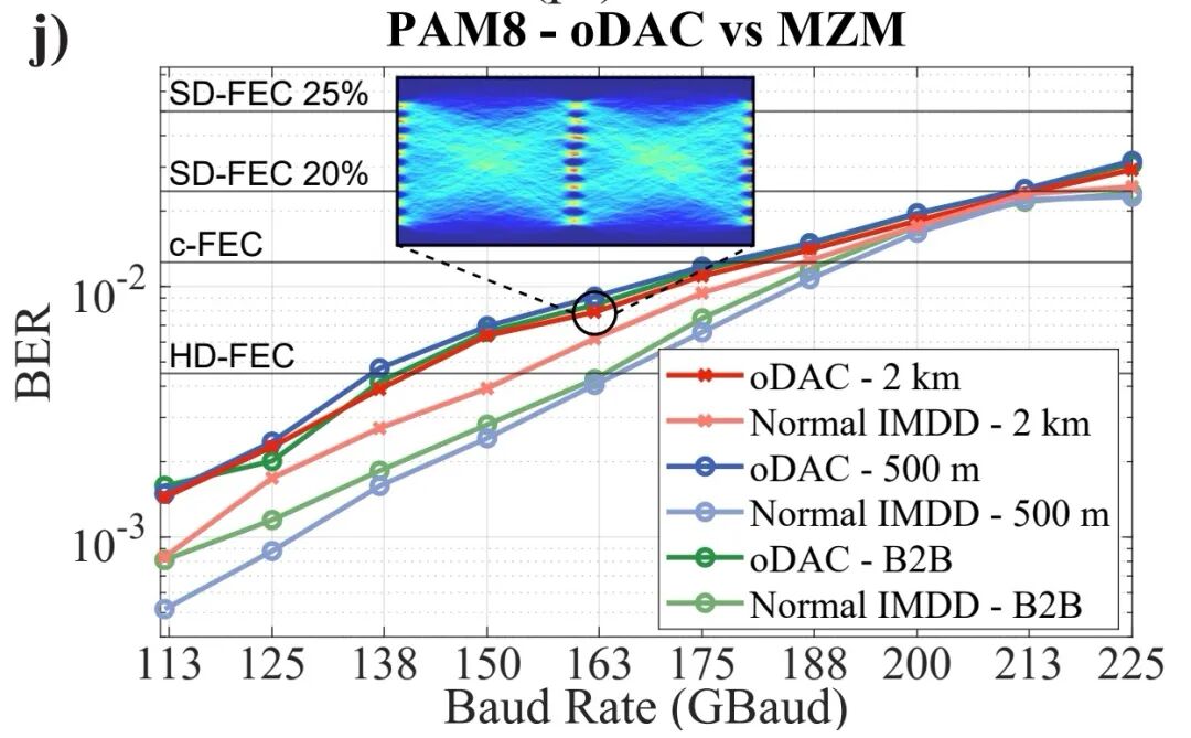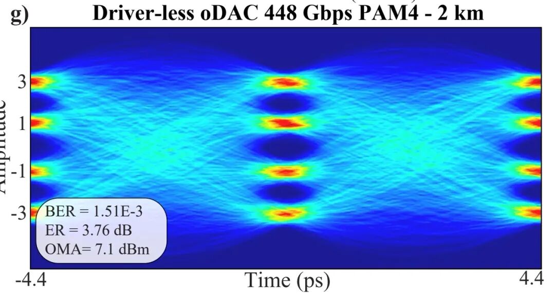 上述结果验证了该oDAC架构可兼容4/6/8电平幅度调制,完全满足下一代DCI 400G单通道的符号率与调制格式需求。