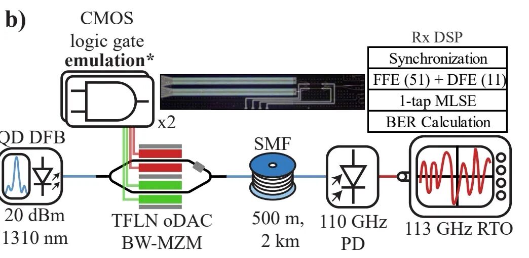1. 光发射链路:20 dBm输出的量子点(QD)DFB激光器提供1310 nm光载波,经仿真逻辑门输出的2路二进制信号直接驱动TFLN BW-MZM oDAC,完成PAM4/PAM6/PAM8信号的光域生成;该oDAC仿真6 dB带宽远超100 GHz,差分Vπ仅为2.2 V。