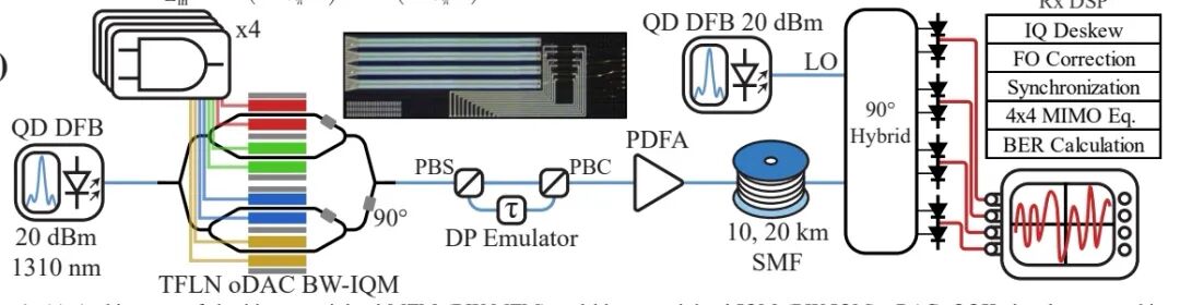 3. 接收与信号处理:oDAC生成的DP-QAM信号与20 dBm 1310 nm QD DFB本振光一同输入2×8光混频器,经4路70 GHz平衡PD完成光电转换,由113 GHz RTO采样;后续完成IQ信号去偏移、重采样至每符号2个采样点、载波与本振频偏校正,采用4×4实系数MIMO均衡器补偿线性失真、相位噪声与平衡PD的带宽限制,最终基于恢复的符号完成BER计算。