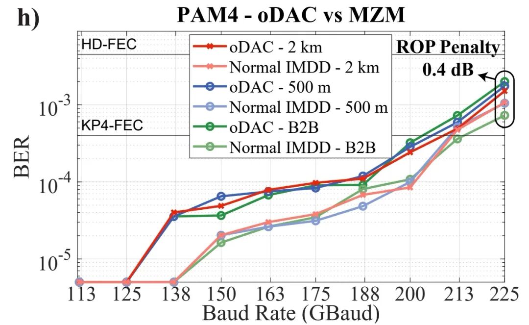 1. PAM4调制:在2 km传输距离下,实现了225 Gbaud PAM4信号传输,净速率达448 Gbps,BER远低于6.7%开销HD-FEC阈值;实测消光比(ER)达3.76 dB,超过200G IEEE标准的最低消光比要求。B2B与2 km传输性能无明显差异,验证了O波段工作下,啁啾对2 km距离内的传输无实测性能劣化,完全适配DR8-2类应用场景。与传统推挽式MZM方案相比,接收光功率(ROP)代价仅0.4 dB。