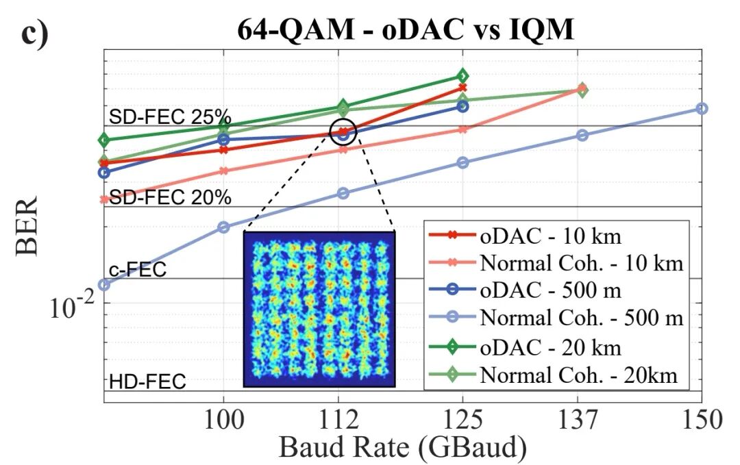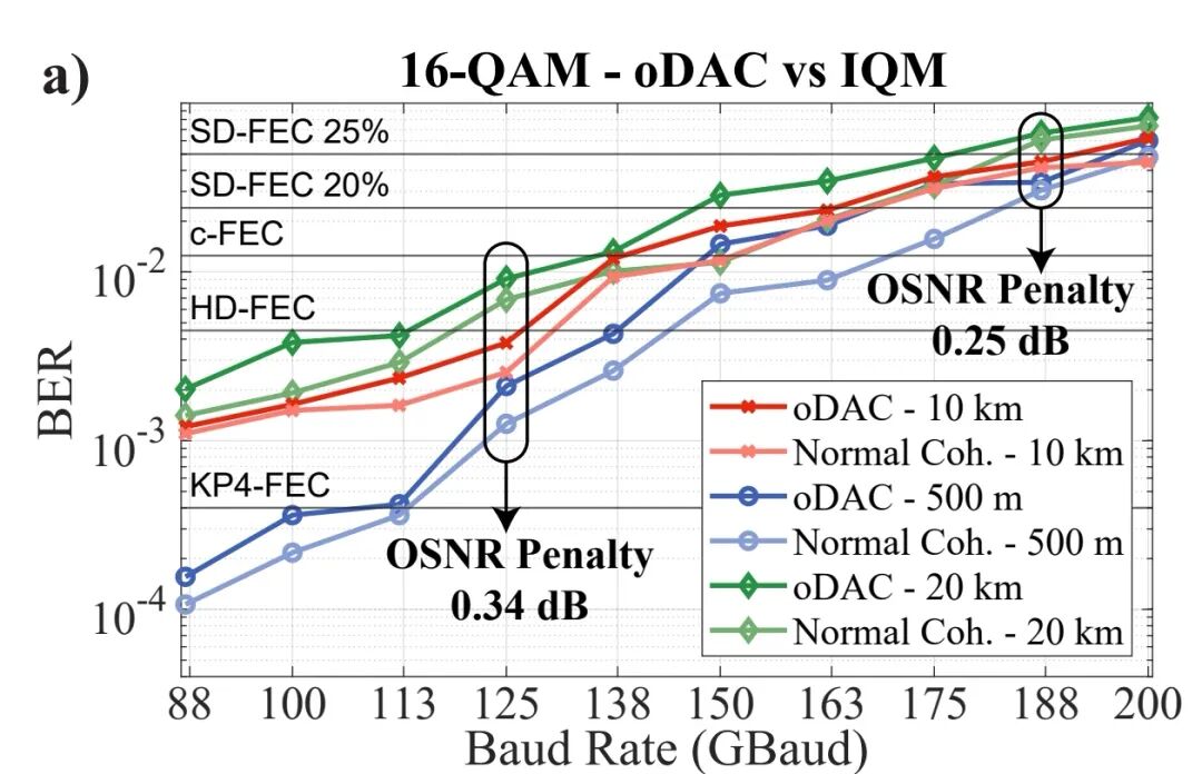 本研究完成了IM/DD与简化相干两大场景的全参数测试,核心结果均达到了当前oDAC技术的最高水平,且实现代价极低。