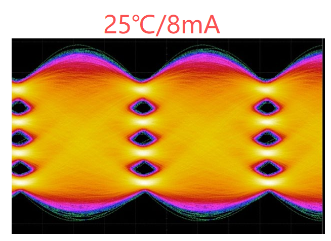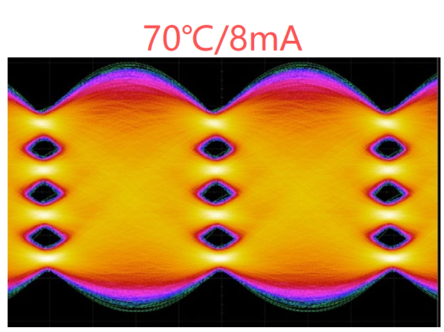 基于任意波形发生器的 200G-PAM4 光眼图测试中,采用 106.25 GBd 的 PAM4 信号 + PRBS15Q 码型,通过 50μm 多模光纤背靠背传输,结果显示:器件在 25℃/8mA 与 70℃/8mA 条件下均有足够的眼图张开度,且传输色散眼图闭合代价(TDECQ)在各温度下均低于 4dB,完全满足 200G-PAM4 链路的传输要求。