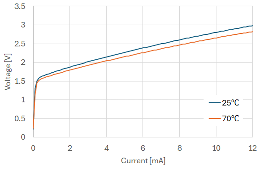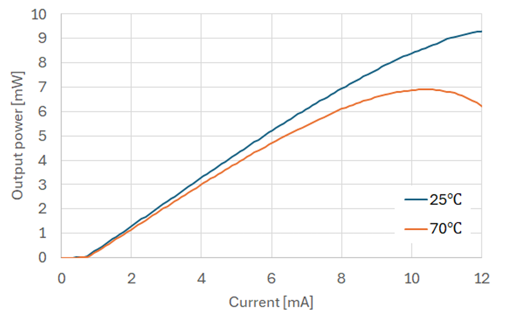 在 25℃与 70℃的典型工况下,器件 LIV 特性表现稳定:8mA 偏置下,25℃输出功率 7.2mW、70℃输出功率6.3mW,高温功率仅小幅衰减;电压方面,8mA 偏置下 25℃ 2.6V、70℃ 2.5V,随温度升高略有下降,展现出良好的高温低功耗特性。