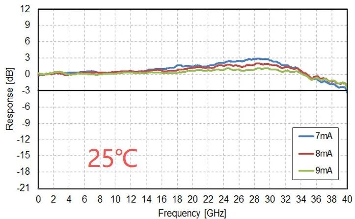 调制带宽是高速 VCSEL 的核心指标,索尼通过 Form Factor GSG 探针接触器件,搭配 Keysight N4373E PNA 网络分析仪完成 S21 响应测试,结果显示器件调制带宽随温度升高保持优异稳定性:该器件 25℃超 40GHz,70℃时 37GHz,80℃时仍达 36GHz,25℃~80℃全温区稳定超 35GHz,完全满足 200G-PAM4 的带宽需求。更重要的是,其 S21 响应的过冲水平在全温区均控制在 2dB 左右,低过冲特性有效避免信号失真,完美匹配 PAM4 多电平调制对信号平坦度的严苛要求。