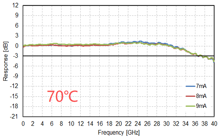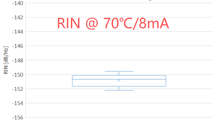 相对强度噪声(RIN)是影响 PAM4 信号传输质量的关键,索尼这款VCSEL器件在70℃/8mA 工作条件下,RIN 水平稳定在 -150dB/Hz 以下 ,实现了低噪声特性。这一结果验证了其在宽带宽设计的同时,未牺牲噪声性能,带宽与噪声的协同优化,有效保证了 200G-PAM4 信号的传输质量。