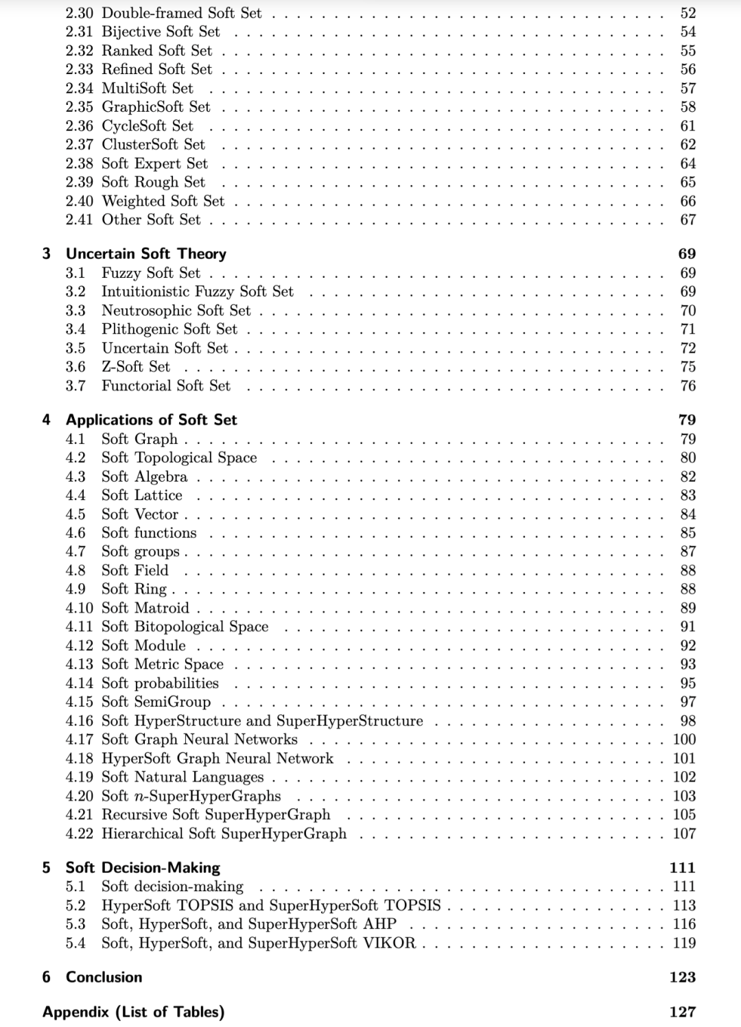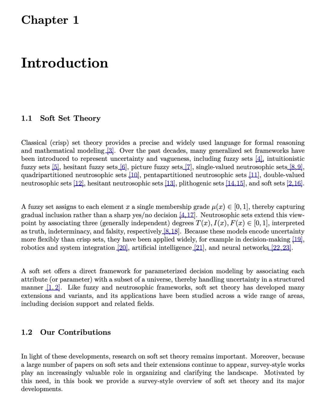 鉴于上述发展,软集理论的研究仍然具有重要意义。此外,由于大量关于软集及其扩展的论文持续涌现,综述式著作在梳理与厘清该领域研究格局方面正发挥着日益重要的价值。受此需求驱动,本书旨在提供一份关于软集理论及其主要进展的综述式概述。