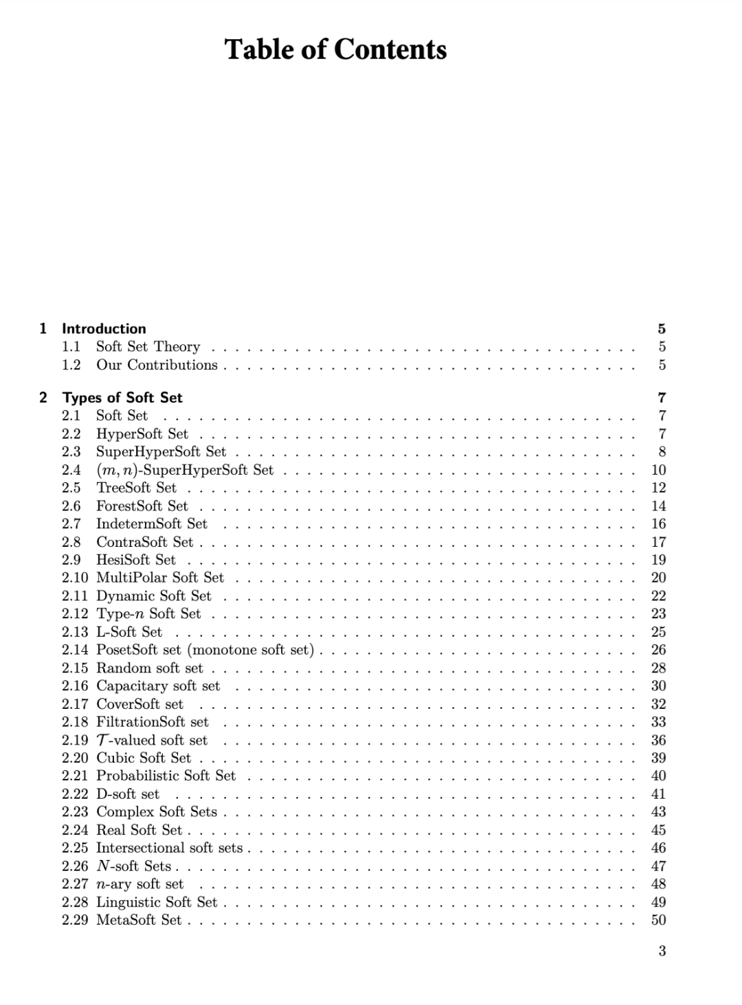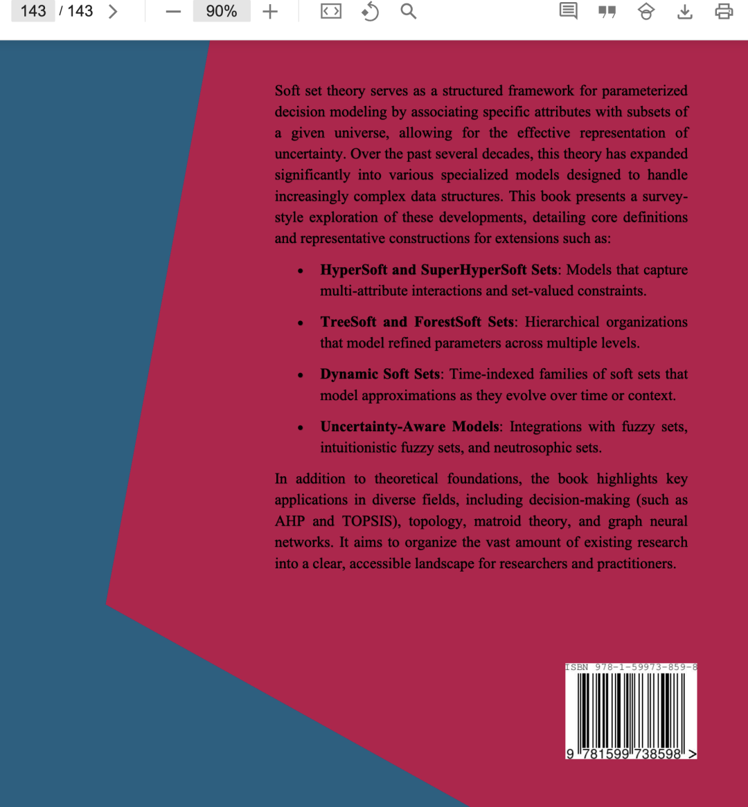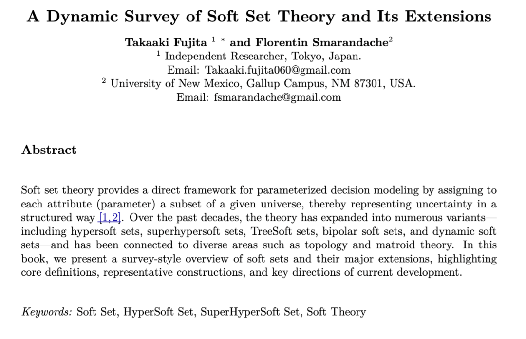 软集理论通过将每个属性(参数)映射为给定论域的一个子集,为参数化决策建模提供了一个直接的框架,从而以结构化的方式表示不确定性[1, 2]。在过去的几十年中,该理论已拓展出众多变体——包括超软集(hypersoft sets)、超超软集(superhypersoft sets)、树软集(TreeSoft sets)、 bipolar 软集(bipolar soft sets)以及动态软集(dynamic soft sets)等——并与拓扑学、拟阵理论等多个领域建立了联系。在本书中,我们以综述的形式对软集及其主要扩展进行概述,重点阐述其核心定义、代表性构造方法以及当前发展的关键方向。